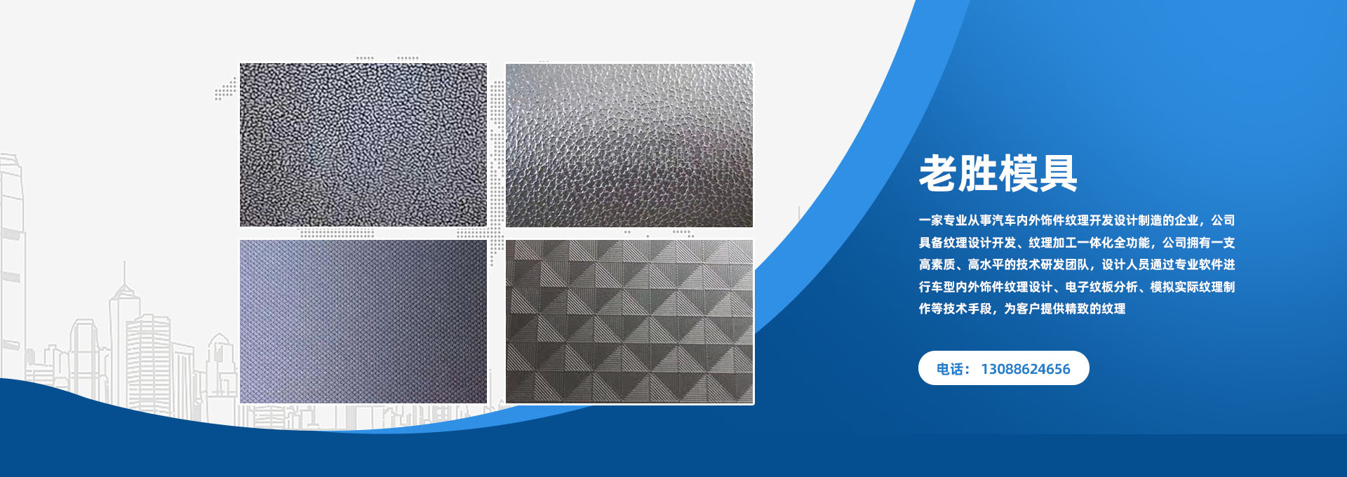 台州市黄岩老胜模具蚀刻有限公司,成立于2016年,有20年制作经验,位于举世闻名的模具之乡—黄岩。公司现有员工20多人,厂房面积1500平方米,从一个作坊式加工向现在皮纹咬花高科技的锐变,历经无数个春秋,专业从事模具纹理加工。公司具备纹理设计开发、纹理加工一体化全功能,公司拥有一支高素质、高水平的技术研发团队,通过吸收国内外先进技术保障纹理精确,设计人员通过专业软件进行车型内外饰件纹理设计、电子纹板分析、模拟实际纹理制作等技术手段,为客户提供的纹理。另外我们建有大量的纹